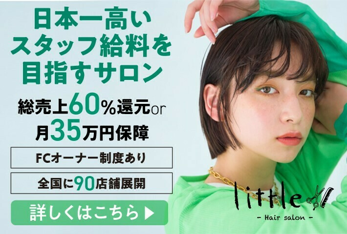 ☆★いま美容師が選ぶサロン★☆ little【リトル】なら きっとあなたの希望が叶えられる! ●高いスタッフ給与 ●プライベートが充実できる 「日本一」働きやすい 美容師に選ばれるサロンを目指しています♪ ★little【リトル】アカデミー・講師インストラクター★ あなたのキャリアを活かしませんか? ★little【リトル】全店・転職応援キャンペーン★ 70%バック(3ヵ月) 50%バック(6ヵ月) ★選べる保障給★ 50万円(月22日実施) 40万円(月18日実施) 30万円(短時間・月20日実施) \\ little【リトル】給与実績 // 25歳女性・入社3ヵ月 50万円(売上71万円・月22日実施) (※)転職応援キャンペーンで70%バック♪ 28歳女性・入社6ヵ月 40万円(売上80万円・月18日実施) (※)保障給で公私充実! 31歳女性・時短・入社1年 30万円(売上60万円・月20日実施) (※)時短でも保障給があるから安心◎ ★はじめての業務委託・確定申告サポート★ 確定申告をゼロ円で! 税理士紹介サービス【完全無料】 →インボイス番号取得、青色申請、確定申告を請け負います! (※)半年に1度領収書をまとめるだけでOK♪ (※)もちろんご自身での確定申告もOK♪ ★正社員希望の方へ★ little【リトル】には300名の社員が! 随時雇用契約の変更もOK♪ 〇自由出勤×高歩合 〇集客サイトAWARD全国受賞👑 〇新規フリー月間2,000名以上来店! 〇ママ&パパ美容師も多数活躍中♪ 複数店舗の見学も大歓迎! まずはぜひお気軽にご連絡ください♪
