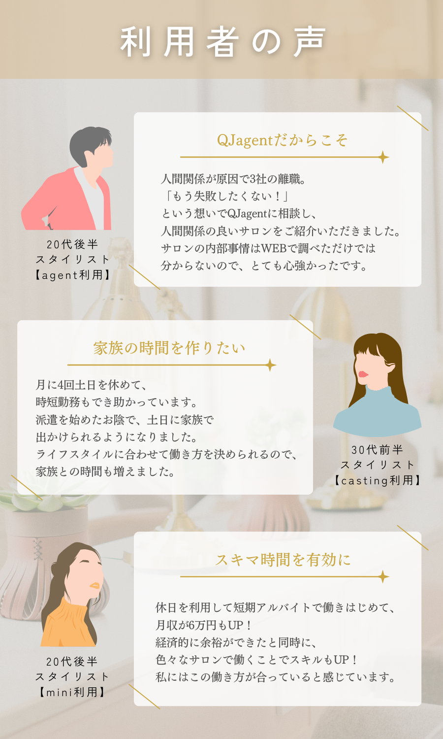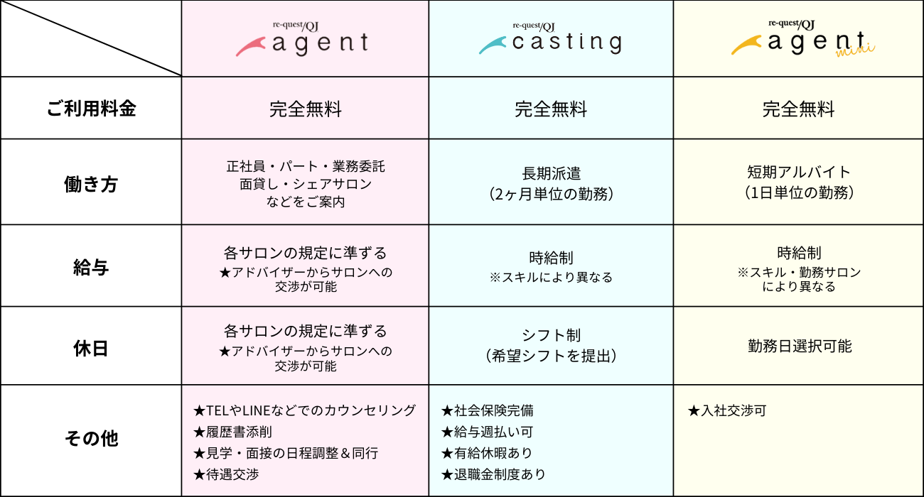 転職先サロンを紹介するサポートサービス。就職・転職に関する相談や求人サロン紹介・面接サポート・待遇交渉など様々なサービスを無料で利用できます。