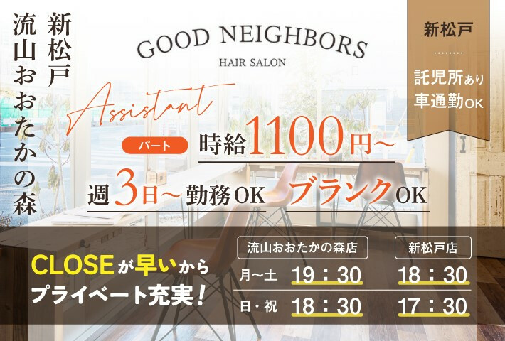 週2日出勤からOK! あなたに合った働き方をご相談ください♪ ◆交通費1.5万円まで ◆平日のみOK ◆1日5h~(9:00 ~18:00) ◆週2日~ ◆土日祝のみOK ◆スキルに応じて時給UP 《子育て世代を応援します!》 ※就業証明書の発行も可能なので お子さんの保育園入園もサポート! ※美容師復帰を応援!ブランクOK! 一人ひとりのブランク歴やスキルによって、 まずはアシスタントから始めることも可能です。 現場スタイリストが、トレンドカットや 商材のことをていねいに指導いたします。 また空き時間はモデルカットやレッスン動画、 先輩からカットを教わるなどスキルアップに使えます。 ⇒最短1ヶ月でスタイリスト復帰も可能♪ 子育て、家庭と両立しながら働く、主婦・主夫歓迎です!