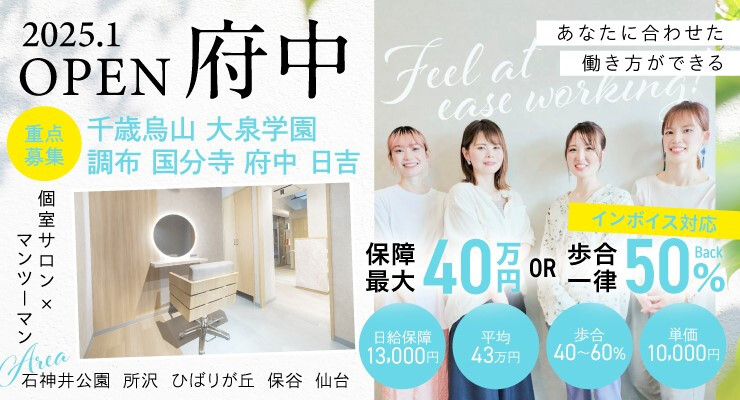 高客単価マンツーマン制なので「自分のペースで働きたい方」「バリバリ稼ぎたい方」などそれぞれの働き方に合わせてサロンワークが可能♪