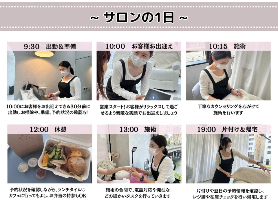 \未経験者大歓迎!/ 研修充実!技術全てレクチャーします◎ 雇用形態を問わず、勤務時間は【自由シフト制】 あなたの夢や育児など、大切にしたいことを応援します! 【充実の研修制度】 外部の研修機関と連携したプログラムにて技術レクチャーが可能。 マツエク、マツパ、アイブロウワックスなど興味のある施術を面接時にお伝え下さい。 あなたの経験も加味し、ご希望の研修からスタートします。 興味がある方は全ての研修受講可能! またモデル集客も全面協力! 【ライフスタイルに合わせた雇用形態】 正社員/パート/業務委託 3つの働き方を選べます。 どの雇用形態でも安心して働けるよう、顧問弁護士・税理士と契約しており、ご相談も可能です。 ▷給与に関する税金の計算など、徹底した役割分担で業務の円滑を図っています。 <正社員> 月給24万円~(試用期間3~6ヶ月) 試用期間後:月給25万円~+歩合 (※店舗により異なる) 【独立思考の方も!】 これから独立を目指す方、そのためのノウハウも提供します。 ぜひ当サロンでたくさんの技術とノウハウを学んでください! 独立の際は、応援しながら快く送り出します♪ 高い技術レベルをスタッフ全員が提供できるよう、スキルアップに努め、長く愛されるサロンとしてお客様一人ひとりの記憶に残る… そんな魅力的なサロンに一緒にしていきましょう! まずはお気軽にサロン見学から♪ ご連絡お待ちしております!