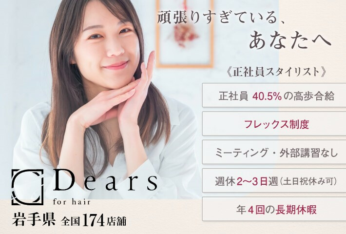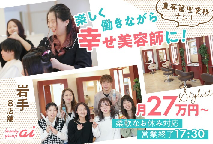 ★私たちの想い★ 私たちは「美」を通して、地域のみなさんの毎日をちょっと特別に、ちょっと楽しくするお手伝いをしています。 美容師一人ひとりが、自分らしくのびのび働ける場所であることを大切にしています。 お客様だけでなく、スタッフも笑顔になれるサロンを目指しています。 ★働きやすさバツグン★ ・週休2日&8時間勤務で無理なく働ける ・土日祝のお休みも相談OK ・売上の40%以上をしっかり還元 ・社会保険完備で安心 ・通いやすい好立地 ★成長もキャリアも応援★ 充実の教育制度で、しっかりスキルアップ! アシスタントからスタイリスト、そして将来は自分のお店を持つ夢までサポートします。 「セカンドキャリア」や「社内独立」の道もあり、長く働ける環境です。