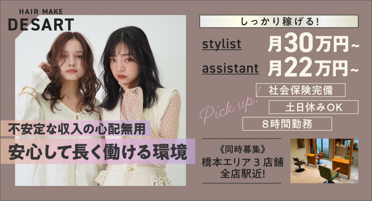 • 社会保険完備(雇用保険/労災保険/健康保険または美容国保か整容国保/厚生年金)