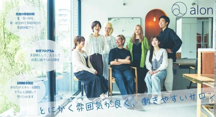 alon(アロン)はJR五反田駅からほど近い設立11年目のサロン。お客さまから「とにかくお店とスタッフの雰囲気が良い」と褒めていただくことが特徴です。そう褒めていただけるのは、alonがスタッフにとって「働きやすい場所・人として成長できる場所」であり続けてきたから。だからこそ、あなたにとって最高のサロン(職場)であると自信を持っていえるのです。