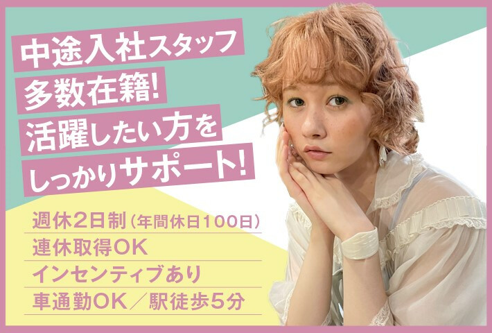 月給 30万円〜 個人売上月間75万を超える分より、 以下の%で歩合が付きます。 指名歩合:40% フリー歩合:25% 上記以外に、以下の手当有 ・店販手当:売上の25%を個人バック(ただし自社PBのみ対象) ・チーム生産性手当 ・スタイリストとアイリストを兼務いただける場合は、別途1万円手当支給 【給与イメージ】※月6~8日休み ・月間個人売上 100万円 指名割合:30%、フリー割合:70% →月給30万+歩合総額73,750円=373,750円+各種手当 ・月間個人売上 100万円 指名割合:50%、フリー割合:50% →月給30万+歩合総額81,250円=381,250円+各種手当 ・月間個人売上 100万円 指名割合:70%、フリー割合:30% →月給30万+歩合総額88,750円=388,750円+各種手当 ※月間150万個人売上 月給+歩合 50~60万+各種手当 ※月間200万個人売上 月給+歩合 65~75万+各種手当