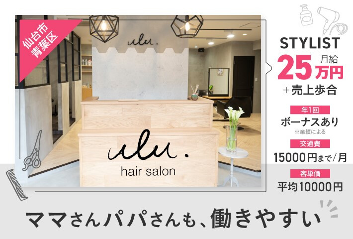 ★私たちの想い★ 私たちは「美」を通して、地域のみなさんの毎日をちょっと特別に、ちょっと楽しくするお手伝いをしています。 美容師一人ひとりが、自分らしくのびのび働ける場所であることを大切にしています。 お客様だけでなく、スタッフも笑顔になれるサロンを目指しています。 ★働きやすさバツグン★ ・週休2日&8時間勤務で無理なく働ける ・土日祝のお休みも相談OK ・売上の40%以上をしっかり還元 ・社会保険完備で安心 ・通いやすい好立地 ★成長もキャリアも応援★ 充実の教育制度で、しっかりスキルアップ! アシスタントからスタイリスト、そして将来は自分のお店を持つ夢までサポートします。 「セカンドキャリア」や「社内独立」の道もあり、長く働ける環境です。