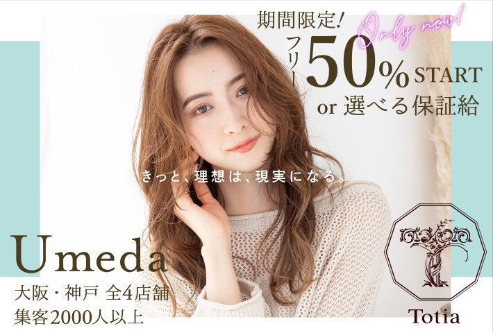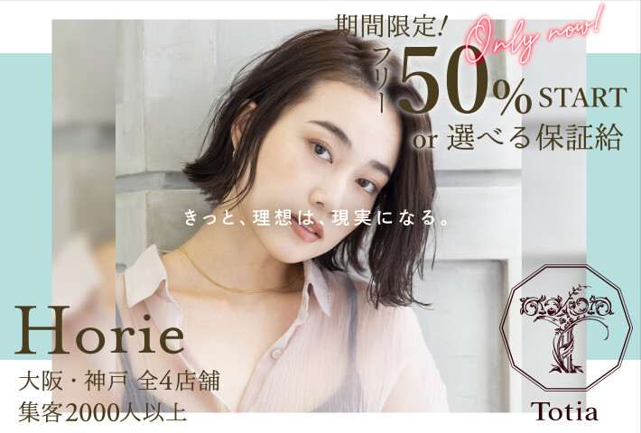 【Totiaなら安心!こんな心配無用です!】 ■ デビュー後に入客できない? Totiaでは、美容師がお客様と接する瞬間を大切にしています。 月2000人以上の集客力があり、デビュー後はしっかりと入客の機会を手にし、 思う存分活躍できる環境があります。 ■ 夢があるけど未来が不安… Totiaには、幹部登用制度など、未来を切り開くサポートが充実。 不安な点も話し合い、共に解決策を見つけます。あなたの夢を私たちに教えてください。 Totiaがその実現を全力でサポートします! ■ 自分の時間が取れない? Totiaではスタッフの意見を大切にし、働きやすい環境づくりに力を入れています。 無駄な残業や雑務が発生しないよう、常に改善を図っています。 プライベートも充実できるよう、恒例行事のBBQや慰安旅行、撮影会なども自由参加です! ■ 最新設備が揃ったサロン 全席にTVやタブレット、充電器付きのセット面、最新のフルフラットシャンプー台など、最新設備を完備。 一流の商材を使った多彩なメニューで、お客様もスタッフもワクワクする空間です。 Totiaは、成長と充実した生活を全力でサポートします。全国トップクラスの環境で、一歩ずつ理想のキャリアを築きながら、仕事もプライベートも大切にしましょう。 サロン見学も随時受け付けていますので、気軽にお問い合わせください!