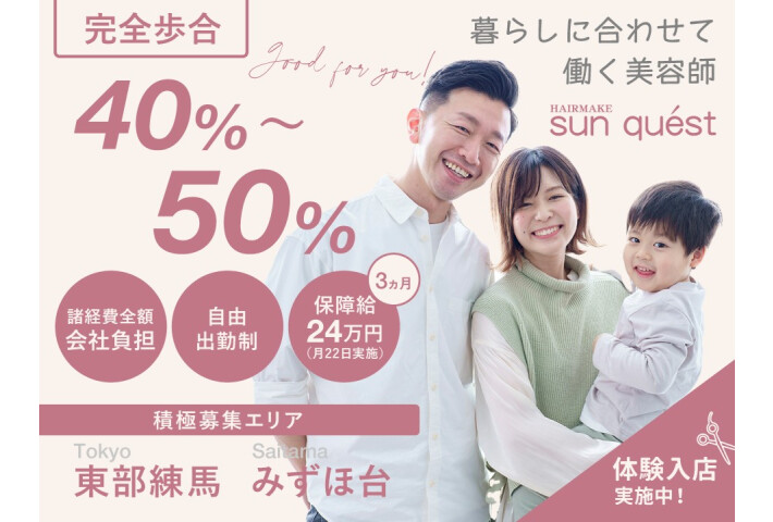 ライフスタイルにあわせた働き方ができる! 融通が利きやすい環境なので 長く安定して活躍することができます! 【歩合最大70%還元】 ★高歩合率でしっかり稼げます!★ 月売上60万円⇒歩合50%/報酬30万円 月売上70万円⇒歩合55%/報酬38.5万円 月売上80万円⇒歩合60%/報酬48.5万円 月売上90万円⇒歩合65%/報酬58.5万円 月売上100万円⇒歩合70%/報酬70万円 自分の頑張りがしっかり反映されます♪ ★2店舗同時募集★ 大宮/千葉 ※集客好調!入客チャンス多数! 〇集客好調につき即入客 〇自由出勤制なのでプライベートも充実♪ 〇ライフスタイルにあわせた雇用形態 パート、業務委託、正社員と働き方を選べます。 〇子育てに理解がある会社♪ 〇手荒れで悩んでいる美容師さん、大歓迎します ☆集客好調 ☆自由出勤 ☆客層20~30代 ☆マンツーマン施術で指名につなげやすい環境