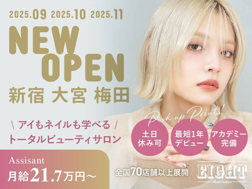 1. 最速の成長を保証する集中育成システム 最短1年〜1年半デビュー EIGHT's独自の集中カリキュラムと講師によるアカデミー研修(関東エリア)により、業界平均よりも遥かに早い期間でのスタイリストデビューが可能です。 効率的な技術習得 勤務時間内に集中して練習をサポートする体制があるため、営業前後の練習を最小限に抑え、質の高い技術習得に集中できます。 2. 経済的な安定と安心の基盤 社会保険完備 雇用保険、労災保険、健康保険、厚生年金といった社会保険を完備しており、将来にわたる安心を会社が保証します。 また、スタイリストデビュー後に業務委託契約に切り替えることもできます。 充実の手当 交通費支給(上限20,000円)に加え、月7日休みの場合には休日手当(12,000円)や売上に応じた手当が支給されるなど、頑張りが給与に反映される仕組みがあります。 昇給・賞与(業績による)の機会もあります。 3. メリハリをつけて働ける環境と文化 完全週休2日制 勤務体系として週休2日制(月7日または月8日を選択)を採用しており、プライベートとの両立が可能です。 土日休みも相談できます。 良好な人間関係 「have fun...」という企業理念のもと、協調性を大切にする文化が根付いています。 人間関係の心配が少なく、明るく前向きな雰囲気の中で働くことができます。 EIGHT'sは、あなたの「美容師になりたい」という夢を、最短で達成できるように全力でサポートします。