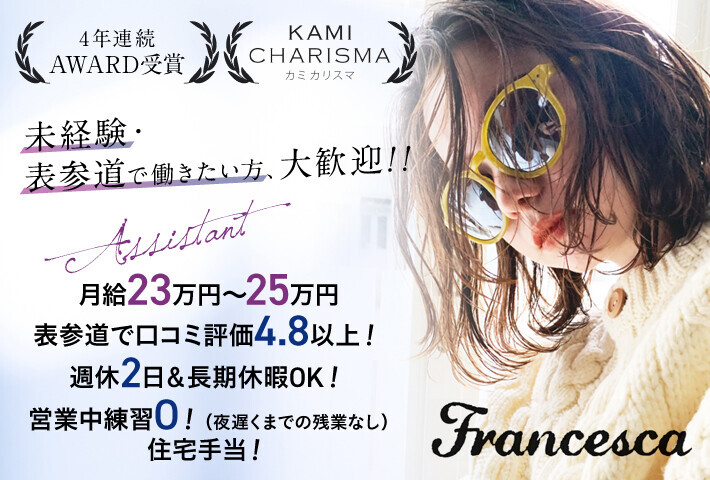 2025年8月 銀座 オープニングスタッフ募集 ★急募店舗★ 東京『渋谷』『門前仲町』『目黒』『中目黒』 大阪『堀江』 【急募店舗限定特典】 ①歩合一律70%還元 ②日給保障¥17,000 ①、②の高い方を報酬として貰えます♪ ※3ヶ月保障 同時募集 【関東】 三軒茶屋 恵比寿 武蔵小杉 大宮 藤沢 【関西】 梅田 【宮城】 仙台 【福岡】 博多 【両方貰える入社特典】 ①新規フリー50%指名60%還元 ②保障給35~50万円※勤務日数・勤務地により異なる ①、②の高い方を報酬として貰えます♪ ※3ヶ月保障 【歩合から諸経費など引きません!】 歩合がそのまま報酬に直結! ※消費税分も全額お渡ししております! ※アシスタント使用代・材料費・光熱費など一切引かれません! ※ドライヤー・アイロンなど道具類も全て会社が用意◎ 【2025年集客サイト 】 『7年連続GOLD Prize受賞』『9年連続SILVER Prize受賞』 客単価1万円以上で集客も絶好調♪ ※入客キャンペーン※ 入客制限なし! 新規のみでも1日5名~入客可能 頑張りが報酬に反映! 例)前職報酬30万円 ⇒現在報酬60万円 ・選べる勤務時間 ・WワークOK※週2日~OK♪ ・余裕をもった施術時間(カット1h~、カットカラー2h~) ・マンツーマン接客・掛け持ちなし ・1日の平均入客数6~10人 ・7月新規フリー客 各店実績 【新宿店:1200人/梅田店:1500人/仙台店:1000人】 ・週休2日※勤務日数応相談可◎ ・土日休み・長期休みOK ・平均顧客単価1万円 ・インボイス説明会・対策あり 私達は夢やビジョンに共感し、共に高め合い成長できる仲間を募集しています。