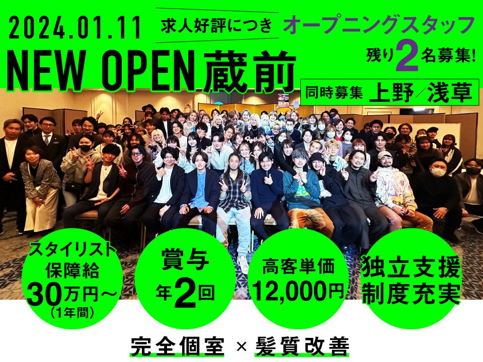 ★NEWOPEN★ 8月 銀座 オープニングスタッフ募集♪ ☆急募エリア☆ 東京『渋谷』『門前仲町』『目黒』『中目黒』 大阪『天王寺』『堀江』 集客好調につき同時募集 【関東】 新宿 三軒茶屋 中野 恵比寿 吉祥寺 武蔵小杉 藤沢 【関西】 梅田 【宮城】 仙台 【福岡】 博多 ☆2025年集客サイト☆ 『7年連続GOLD Prize受賞』『9年連続SILVER Prize受賞』 2024年10月から価格改定をおこないましたが集客も好調♪ 収入が上がったスタッフも多数! ・1日の平均入客数6~10人 ・アシスタント在住 ・新規フリー多数・高リピート率 ・完全週休2日※勤務日数応相談可◎ ・土日休みOK ・長期休みOK ・平均顧客単価1万円 ・FCオーナーなど独立支援も充実 ・子育て世代も活躍中 ・WワークOK※週2日~ご相談ください♪ 【Cloe】では 「お客様」「スタッフ」「サロン」の全てが幸せになる事を目的としサロン運営行っております。 美容師が 「働きやすい環境」 「効率の良いシステム」 「お客様への感動」 を追求し、新しい価値観やワークスタイルを提案します。 営業面ではチームワークを大切にしながら働く事で、それぞれの技術や接客スタイルなどを共有できる環境です。 撮影や教育にも力を入れているため、 サロンワークをやりながら撮影技術を高めたい方、技術に不安がある方やブランクがある方も スキルアップはもちろん、常に高い向上心を持ちながら、人として、いち美容師として成長し続けることができます。 私達は夢やビジョンに共感し、共に高め合い成長できる仲間を探しています。