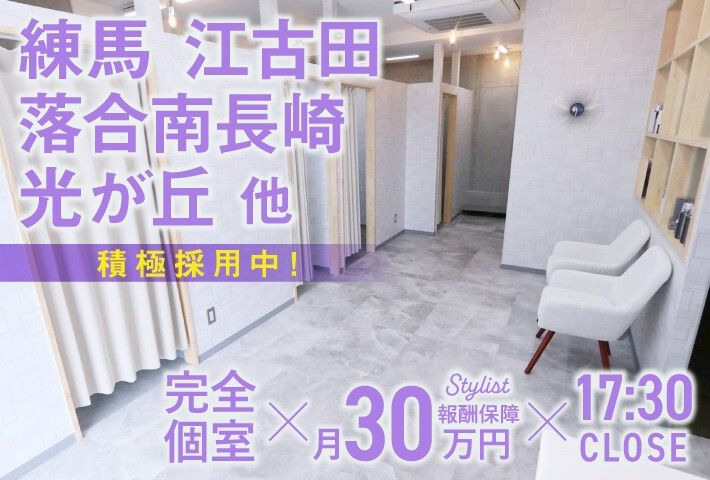 【完全個室サロン】 東京・千葉・神奈川有名エリア アシスタント・スタイリストが活躍中 店長・オーナー続々誕生! *2025年NEWOPEN続々* 1月 越谷レイクタウン・綾瀬 2月 南流山 女性アシスタント、女性スタイリストが活躍中 女性オーナー続々誕生! ☆スタッフ定着率98.7%☆ ■完全週休2日OK ■土日休みOK ■■1カ月短期集中デビューカリキュラム(1ヵ月の実務講習) ■外部講習あり ■人気雑誌の撮影あり 教育は、外部講習・会社内講習を毎月実施! 項目をクリアする毎に3,000円昇給するのでやる気もUP! サロン見学も随時募集しているので 気軽にご連絡ください♪