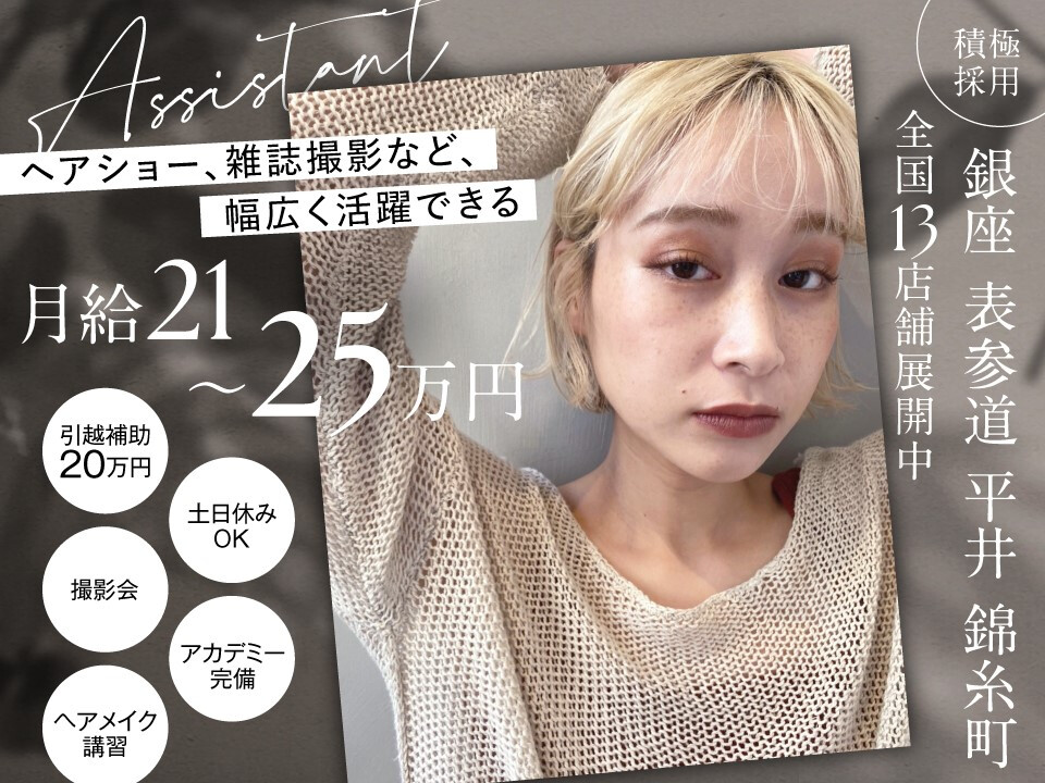 アシスタント業務が好きな方や通信制、 大歓迎いたします♪ 【ここがポイント】 ★50年続く企業ならではの安定感! 福利厚生や各種手当、待遇が充実。 スタッフのサポート体制もしっかりしているので 安心して働くことができます。 ★好立地 東京ビル、伊勢丹、渋谷ヒカリエ、三越をはじめ 各店舗好立地♪ 【さまざまなブランドを展開中】 あなたに合ったサロンを選べるので 得意をするスタイルで活躍できます! また、ライフステージやキャリアに 合わせて異動も可能です。 ◎CLAUDE MONET ハイクオリティーなカット技術で お客さまのライフスタイルにあった デザインをご提供。 ◎AVEDA ブランド力があるアヴェダサロン。 ヘアケア、スキンケアライフスタイル製品を 通じて、真の美しさを引き出します。 ◎SILK HOUSE 本物を知る大人女性のためのサロン。 上質な空間とワンランク上の施術で ブランドトップの高価格帯を実現。 ワークライフバランスを大事にしながら 美容の仕事で輝いてみませんか! お気軽にお問い合わせくださいね♪