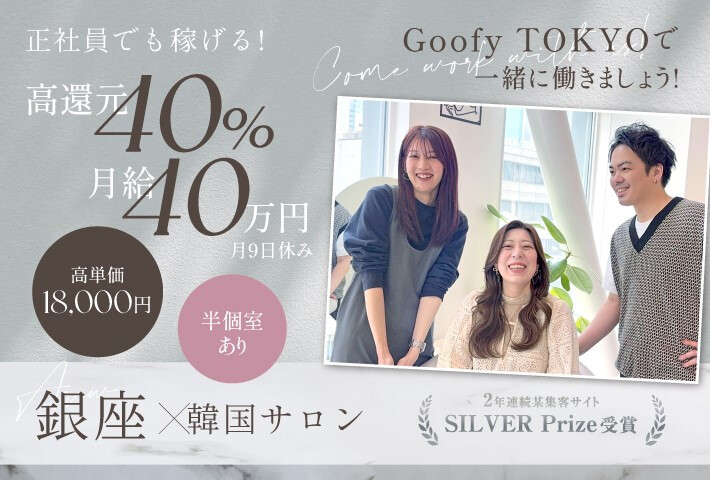 ★集客好調店舗★ 東京『銀座』『恵比寿』『目黒』『中目黒』『門前仲町』 大阪『堀江』 福岡『博多』 【集客好調店舗限定特典】 ①歩合一律70%還元 ②日給保障¥17,000 ①、②の高い方を報酬として貰えます♪ ※3ヶ月保障 同時募集 【関東】 三軒茶屋 武蔵小杉 大宮 藤沢 【関西】 梅田 【宮城】 仙台 【両方貰える入社特典】 ①新規フリー50%指名60%還元 ②保障給35~50万円※勤務日数・勤務地により異なる ①、②の高い方を報酬として貰えます♪ ※3ヶ月保障 【歩合から諸経費など引きません!】 歩合がそのまま報酬に直結! ※消費税分も全額お渡ししております! ※アシスタント使用代・材料費・光熱費など一切引かれません! ※ドライヤー・アイロンなど道具類も全て会社が用意◎ 【2025年集客サイト 】 『7年連続GOLD Prize受賞』『9年連続SILVER Prize受賞』 客単価1万円以上で集客も絶好調♪ ※入客キャンペーン※ 入客制限なし! 新規のみでも1日5名~入客可能 頑張りが報酬に反映! 例)前職報酬30万円 ⇒現在報酬60万円 ・選べる勤務時間 ・WワークOK※週2日~OK♪ ・余裕をもった施術時間(カット1h~、カットカラー2h~) ・マンツーマン接客・掛け持ちなし ・1日の平均入客数6~10人 ・7月新規フリー客 各店実績 【新宿店:1200人/梅田店:1500人/仙台店:1000人】 ・週休2日※勤務日数応相談可◎ ・土日休み・長期休みOK ・平均顧客単価1万円 ・インボイス説明会・対策あり 私達は夢やビジョンに共感し、共に高め合い成長できる仲間を募集しています。