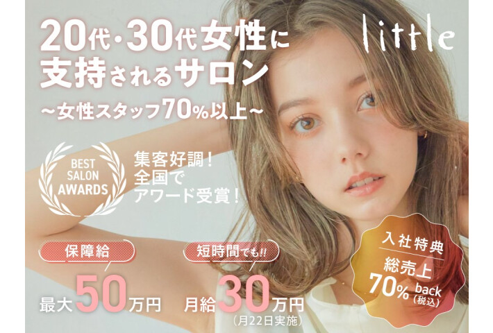 ☆★いま美容師が選ぶサロン★☆ little【リトル】なら きっとあなたの希望が叶えられる! ●高いスタッフ給与 ●プライベートが充実できる 「日本一」働きやすい 美容師に選ばれるサロンを目指しています♪ ★little全店・転職応援キャンペーン★ 【全国一律】月24万円~ ★シェアサロン「muu」続々OPEN★ 2026年2月 新宿 横浜 福岡 札幌 沖縄 【給与】 ★全国一律・月24万円~ ★社会保険完備 【お休み】 ★月8日休み ★実働8時間(残業はほぼゼロ♪) 【教育】 ★営業時間内に施設にてアカデミーレッスン 例)週3サロンワーク &週2アカデミーレッスン(※1) ★スタイリストによる技術指導 ★早期(最短1年~最長1年半)デビュー ★入社半年でジュニア(カット入客)デビュー 【撮影&ヘアショー】 ★定期撮影会 ★Tokyo girls collectionやa-nation など人気イベントの参加実績多数