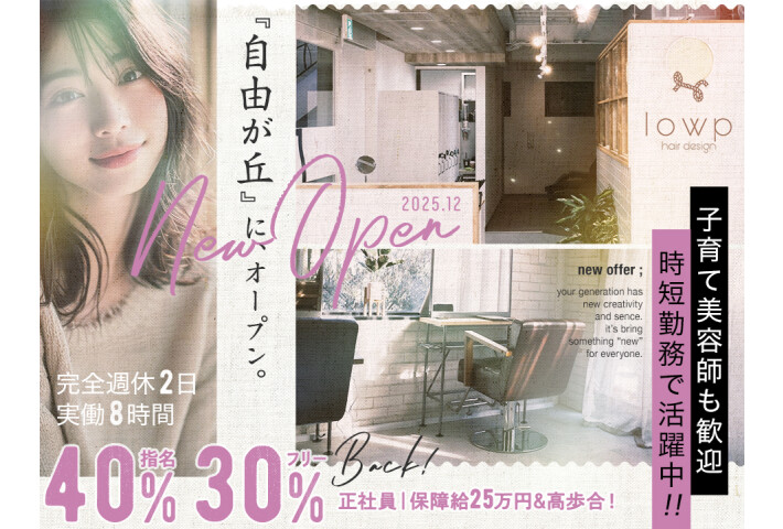 \ 急募店舗 / 流山おおたかの森/武蔵小杉 \ 他全店募集中 / 自由が丘/尾山台/溝の口/登戸/青葉台 たまプラーザ/センター南 ★☆ 1月迄入社/流山おおたかの森店限定特典 ★☆ ★入社祝い金10万円 ★3ヵ月70%バックor下記保証給 保障給60万円(26日実施) 保障給50万円(22日実施) 保障給40万円(18日実施) (※)フル番9:30〜21:30/受付10:00~20:00 (※)勤務スタート応相談 (※)詳細は面接時に (※)先着順・スタッフ定員に達し次第〆切ります。お急ぎください! ★日給2万円 (※)1ヵ月限定 (※)サロン見学を兼ねた1日体験も歓迎 〇新規集客月150~300名 全店舗集客力◎で入客のチャンス多! 〇平均客単価9,000円 〇集客・SNS・ブログ・スタイル投稿・練習会当番など一切不要&ノルマなし! 〇材料費・光熱費・広告費全額会社負担 〇引越費用一部負担 〇完全自由出勤制 時短・週1~土日休みOK 例)①日・月休み/16時退勤 ②毎週日のみ出勤 無駄なことは一切強要なし! 美容師の仕事にしっかり集中できます☆ 新規顧客が多く高単価、 がんばり次第でどんどん稼げる体制です♪ 在籍スタッフからも『働きやすい』と評価が高く 離職率はかなり低め。 美容師が幸せに働くことでお客様の満足度も高まる、 そんな良いサイクルができています♪ \ staff voice / ◇保証給制度があるので安心 ◇忙しい時は皆で協力しあうので助かります ◇スタッフ同士仲が良くストレスフリー