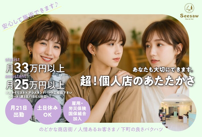 お子さんをお持ちの美容師にも特に働きやすい環境です!勤務時間や急な休みにもしっかり対応してもらえるので子供の体調不良や学校行事などにも心配がありません! 「育児サポート」でこれから復帰を考えていて小さいお子さんを抱えていても安心してお勤めいただけます。 各自、環境やライフスタイルに合った働き方で、プロジェクトチームによる独自カリキュラムでの育成や情報配信によるスキルアップの充実!会社負担で内外部の講習が受講できるのも魅力、Z世代カリスマ美容師による動画教育サポートも充実!、パートでも自由に参加が出来て美容師としてスキルアップに繋がりモチベーションになっています! パートさんにも歩合がつくので、やりがいを感じられます! 『パートさんでも、常時売上上位の実績を持つ、ママさんスタ入りスタントさんもいます!』 また、予約制ではないので時短勤務でも稼げる☆ 自宅から通える距離にあるので徒歩、自転車通勤もできます♪ 【働きながらの子育てに嬉しい産休・育休】 産休・育休取得後に復帰し、活躍しているスタッフも多数! 女性も男性もプライベートに合わせて働けます。 勤務時間帯に関しても気軽に相談ください。 ■アシスタント 時給1,226円~+歩合 昇給(随時) 交通費支給 売上手当 残業手当 ★Wワーク可能 副収入を得たい方も時間、勤務日数に応じます。 まずは応募にてご相談ください。