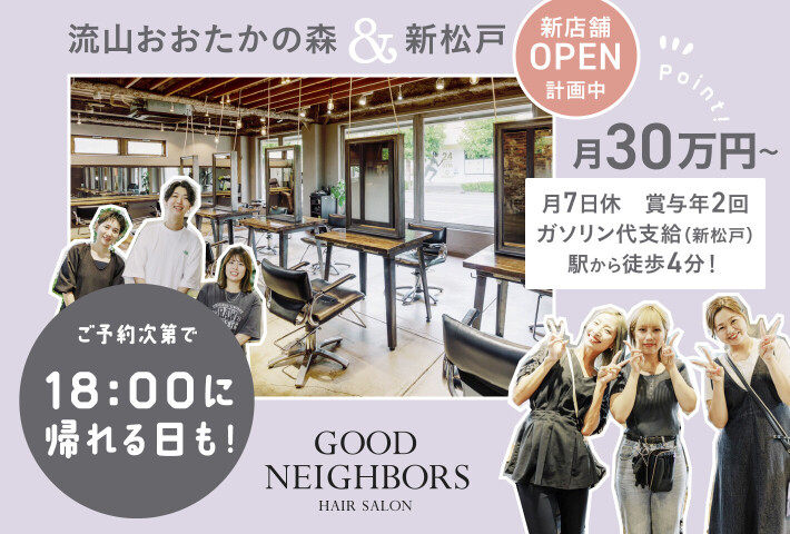 \ 急募店舗 / 流山おおたかの森/武蔵小杉 \ 他全店募集中 / 自由が丘/尾山台/溝の口/登戸/青葉台 たまプラーザ/センター南 ★☆ 1月迄入社/流山おおたかの森店限定特典 ★☆ ★入社祝い金10万円 ★3ヵ月70%バックor下記保証給 保障給60万円(26日実施) 保障給50万円(22日実施) 保障給40万円(18日実施) (※)フル番9:30〜21:30/受付10:00~20:00 (※)勤務スタート応相談 (※)詳細は面接時に (※)先着順・スタッフ定員に達し次第〆切ります。お急ぎください! ★日給2万円 (※)1ヵ月限定 (※)サロン見学を兼ねた1日体験も歓迎 〇新規集客月150~300名 全店舗集客力◎で入客のチャンス多! 〇平均客単価9,000円 〇集客・SNS・ブログ・スタイル投稿・練習会当番など一切不要&ノルマなし! 〇材料費・光熱費・広告費全額会社負担 〇引越費用一部負担 〇完全自由出勤制 時短・週1~土日休みOK 例)①日・月休み/16時退勤 ②毎週日のみ出勤 無駄なことは一切強要なし! 美容師の仕事にしっかり集中できます☆ 新規顧客が多く高単価、 がんばり次第でどんどん稼げる体制です♪ 在籍スタッフからも『働きやすい』と評価が高く 離職率はかなり低め。 美容師が幸せに働くことでお客様の満足度も高まる、 そんな良いサイクルができています♪ \ staff voice / ◇保証給制度があるので安心 ◇忙しい時は皆で協力しあうので助かります ◇スタッフ同士仲が良くストレスフリー