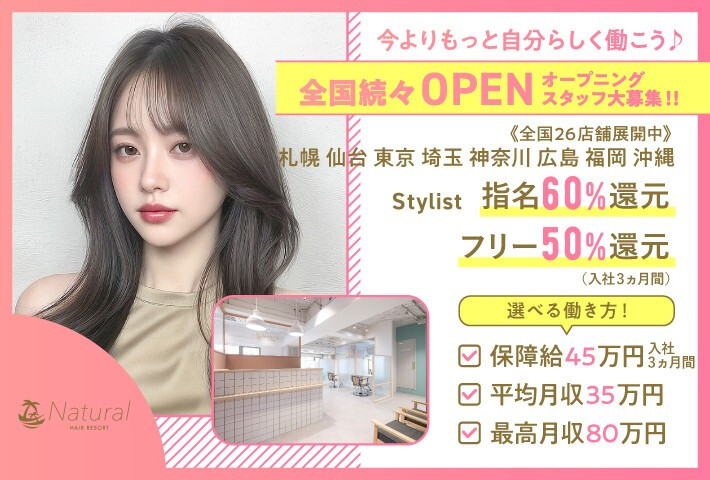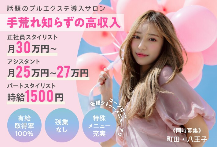 【完全個室サロン】 東京・千葉・神奈川有名エリア アシスタント・スタイリストが活躍中 店長・オーナー続々誕生! *2025年NEWOPEN続々* 1月 越谷レイクタウン・綾瀬 2月 南流山 女性アシスタント、女性スタイリストが活躍中 女性オーナー続々誕生! ☆スタッフ定着率98.7%☆ ■完全週休2日OK ■土日休みOK ■■1カ月短期集中デビューカリキュラム(1ヵ月の実務講習) ■外部講習あり ■人気雑誌の撮影あり 教育は、外部講習・会社内講習を毎月実施! 項目をクリアする毎に3,000円昇給するのでやる気もUP! サロン見学も随時募集しているので 気軽にご連絡ください♪