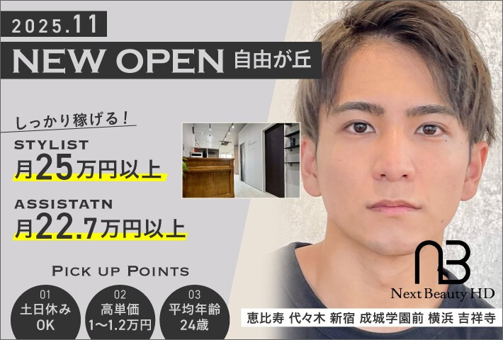 ▽新卒&中途アシスタント:月給23万円〜 基本給23万(研修期間中3ヶ月21万) 技術売上8%+店販売上20% 19時半帰宅可・実働8時間・2年以内デビュー出来る仕組みを整えています。 (アカデミー/店舗練習会/営業時間内練習) 週休2日以上・正月連休有・有給休暇有・ 月平均9〜10日休み・年休日115日〜 ※給与イメージ: 指名売上30万 +店販1万の場合 月給:25万6000円+交通費+その他手当 アカデミー制度で営業時間内の練習会やカリキュラムがあり、営業前や後のレッスンはありません。 ですので、早上がりの人は19時に退社します。遅くまで残ることの無いようにしています。 また、スタイリストデビューの前の段階で、カラーリスト・プレスタイリストなど、出来る技術や得意な技術に合わせて、自己集客のお客様を営業中に担当することができます。 新卒は3ヶ月、中途の人は入社後すぐに自分のお客様を担当できるので、やりがいがありますよ! 頑張り次第では1〜2年でデビュー。しっかりとお客様に価値を提供するサロンですので、努力はもちろん必要です。店舗展開や、FCオーナーとして、独立する先輩もいるので、自分が活躍出来ないということはありません。 新卒の方(中途の方は希望制)は、1年目は、2〜3店舗の移動があり、(東京エリアの希望の場合は、表参道エリアとその他のエリア。福岡希望の場合は博多と大名エリア)都内エリアを経験できます。 偏った技術や接客にならず、さまざまな経験ができます。