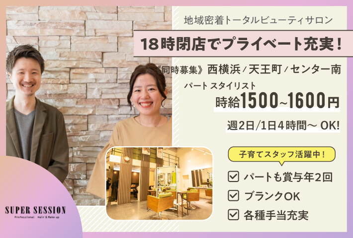 ~パートアシスタントさん大活躍中!~ ■パートアシスタント(時給):¥1,250~¥1,450 +賞与(年2回) ★サービス・商品 ヘアー、ネイル、エステを中心に地域密着44年。 ひとりひとりのお客さまにしっかりと時間を掛けて寄り添っていきます。美容の仕事は流れ作業ではありません。 お客さまは男性2:女性8。30~40代を中心にお子さんからシニアまで幅広くご利用いただいています。 ヘアデザインだけでなく、ヘアケア・スキンケアやインナーケアまで、お客様の美容と健康のお悩みを解決できる、一生通い続けられる美容室です。 ★社風 18時には閉店、週休2日制でもお給料は高水準! オンとオフはしっかり切り替えてプライベートも大切にしようという社風なので付き合いも自由♪ 早く帰ってしっかり休み、翌日の仕事に備えリフレッシュしましょう! ★制度・環境 ◆お子さんから大人まで気軽に利用できる地域密着サロン♪ ◆各店最寄り駅から徒歩3~5分圏内の好立地☆ ◆18時閉店でも平均1万円~1.3万円の高単価×リピート率95%以上!生産性も業界トップクラス♪ ◆時短正社員やパートさんもOK!小さいお子さんのいるママさんやブランクがあった方も活躍しています♪ ◆教育システム充実!講習費用の一部会社負担制度も有り!