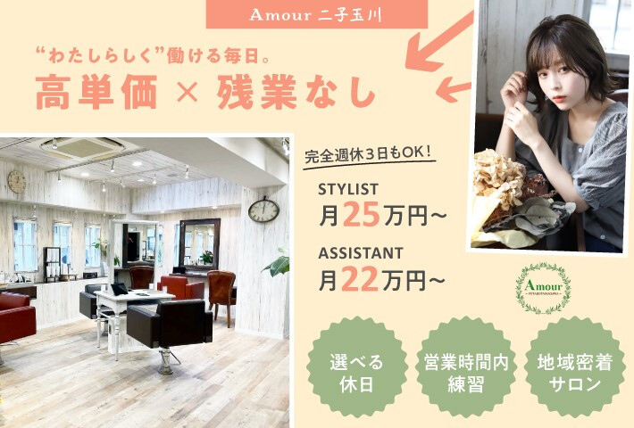 ★ライフスタイルに合わせて長く輝こう★ 子育て世代・長期ブランクがある方を とことん支援します! ★9月までの限定募集★ あなたにお願いしたいお客さまがいるので お気軽にお問い合わせくださいね♪ 【子育て世代が働きやすい理由!】 ●あなたにベストな働き方ができる! ・「週1日」「13時まで」「金土日だけ」「週5日」など 時間を有効活用しながら働くことができます♪ ・パートはもちろん、働き方が多種多様 (週1日からの時給制や売上に対しての完全歩合制) ●お客さまに恵まれている! スタッフの子育てに寛容なお客さまばかり! スタッフはもちろん、お客さまも子育てに 協力的で温かいサロンです♪ ●休みが取りやすい! 急なお子さまの用事など、みんなで協力 しあって対応していきます! 【美容師復帰をとことん応援します】 20年の長期ブランクから復帰した実績あり♪ 子育てが落ち着いて、再び美容師に 復帰したい方など全面的に応援します! まずはできる技術から入客&練習しながら 復帰を目指しましょう! ◇スーパーアシスタント大歓迎 (アシスタント業務が好きな方) ◇産休復帰率100% ◇有給取得率100% ◇土日休み ◇社割 ◇客層:40代 【レイブランカってどんなサロン?】 世田谷三宿で30年以上のトータルビューティーサロン。 ネイル・まつエクから大切な日のヘアメイク・着付まで。 キッズカットも大好評です。 お客さまの来店周期は月1~2回と早いので 新しく入られた方も、すぐにお客さまと 近くなれるはずです♪ またオリジナルのシャンプーやトリートメントも大好評。 素肌の美しさを引き出すスキンケア商品においては スタッフも愛用中♪ サロン専売品のスキンケアやヘアケア商品も充実しています。