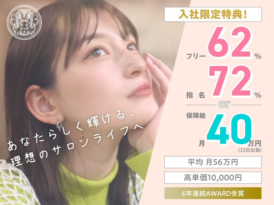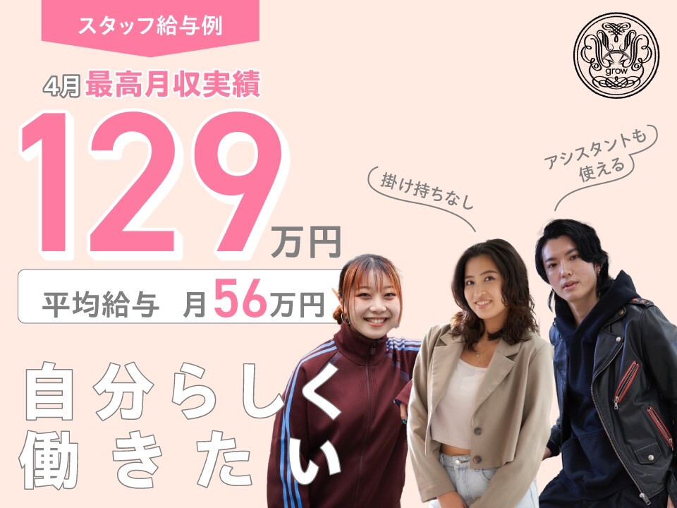 ◆毎月新店OPEN◆ 急成長サロンだからチャンスもたくさん! スタッフの活躍の場を広げるために これからも拡大し続けます! ◆Jr.スタイリストも保障給33.5万円◆ 働き方×稼ぎ方×プライベート… 選択肢が豊富だから理想が叶う! 「正社員or業務委託」 「たくさん稼ぎたいorプライベート派」など バランスよく働ける環境です。 【保障給+歩合で稼げる!】 総売上100万円を超えた「売上の30%」が歩合になります。 ※スタイリスト歴5年実績:平均客単価8000円 総売上120万円(入客150名)=保障給33.5万円+歩合6万円 ⇒総支給39.5万円 ◆報酬実績◆ *9~16時×週4出勤 報酬25万円/入客70名 *1日8h勤務×完全週休2日 報酬45万円/入客150名 *トップスタイリスト 報酬95万円/入客220名 *新人スタイリスト 報酬35万円/入客150名 ●賞与年2回(7月/12月) 総指名売上の3%+業績により還元 ●ビューティーアワード常連 ●スタッフ定着率96% ●育休実績あり ●土日休みOK ●時短勤務OK ●残業なし 【3ヵ月で売上100万円へ】 顧客がいない方、 マンツーマンに慣れていない方、 デビューしたての方など。 まずはきちんとヒアリングをして 3ヵ月で売上100万円を 達成させていきましょう! 【“通いやすい”ד入客しやすい”】 お客さまが無理なく通いやすいサロン。 だから全店いつでも大盛況。 スタイリストの方は、特出した技術や 過剰なサービス、SNSによる発信力が なくても大丈夫! どなたでも入客しやすい環境です! 技術にこだわりたい方も! あなた専用クーポンをつくるので 「好きなこと」で活躍しよう!