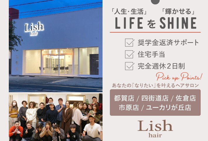 リクエストQJナビ久々の掲載です! 全店同時募集中!! LishのコンセプトはLife「人生・生活」をShine「輝かせる」こと。 スタッフの「人生や生活」も輝く事がLishのコンセプト! 「オーナーやお店の夢」をスタッフが叶えていくのではなく 「スタッフ一人ひとりが描く夢」を叶えることで Lishが成長していくと考えています。 あなたが輝く事がお店のブランドです。面接時あなたの夢を聞かせてください! あなたのやりたいを全力で応援します! 社風 スタッフ間はみんな仲が良く自分のためだけではなく、 人のために頑張れる仲間が揃っています☆ その雰囲気もお客様に喜ばれる要因です! 内装はリゾート風の綺麗な店内。 またサロン撮影や雑誌掲載など クリエイティブな仕事がしたい方もサポートします!