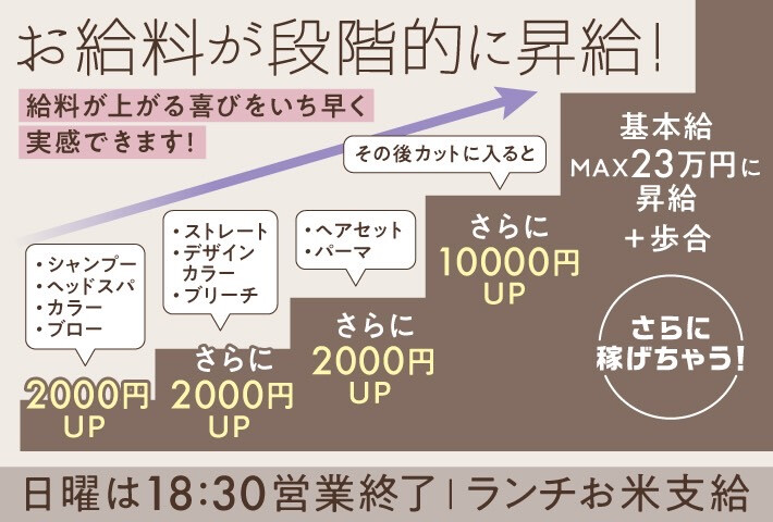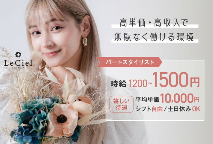 ・全店★4.7以上の高評価! スタッフ教育に力を入れているのは、誰が担当しても 同レベルの技術とおもてなしをご提供するため。 Awardやベストサロン賞を何度も受賞しています! ・集客力に自信あり! 新規のお客様数は毎月200~300人。 新人さんに新規やフリーをお任せできるので、 顧客無しの転職でもご安心ください♪ ・千葉県内で高い待遇! 平均を大きく上回る月給30万スタート♪ ・駅近好立地に新店続々OPEN中! 今後の業務拡大に向け増員募集です! ・ヘア部門とアイ部門があるので、 社内でのキャリアチェンジも可能◎ 【スタイリスト待遇詳細】 27万円~+歩合・各種手当・完全週休2日 ◎技術手当(歩合) └指名売上100万円超で30%バック ◎各種手当 └撮影手当(モデル代)、役職手当、その他係手当など ◎前職の給与も考慮 [実際の給与一例] ◇27歳スタイリスト/総売上170万円 ⇒月給42万円! (27万円+歩合12万円+α) ◇30歳スタイリスト/総売上210万円 ⇒月給49万円! (27万円+歩合19万円+α) 単価9000円で毎月新規が200~300名★ アシスタントが多く在籍しており 掛け持ちで売上が上がる分、稼げます! ぜひ、お店を見にきてください!
