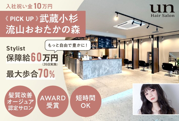 ≪ 時間にゆとりが持てる美容師ライフを実現 ≫ = 髪質改善オージュア認定サロン un = 流山おおたかの森・溝の口・たまプラーザ・センター南・登戸・青葉台 ** 全店パートスタイリスト大募集! ** お子様のいる美容師さんや時間給で働きたい方にはお勧めのサロン♪ スタッフ同士仲良も良く雰囲気も◎ 急なお子様の発熱やお迎えも ママさん美容師が多数在籍しているので、 みんな気持ちがわかりあえ、快く助け合っています☆ もちろんママさん美容師でない方も大歓迎です! 売上を気にしないで働きたいという方にお勧めです。 ▶時給1400円~ 指名売上50万円以上=時給1500円 指名売上55万円以上=時給1600円 ▶出勤自由 時間・お休みの設定自由 もちろん土日休みもOK いかに働くスタッフが楽しく自由に稼げて プライベートも大切にできるかを大切にしています☆ ▶ブランクOK 技術や接客に自信の無い方もご安心下さい。 peek-a-boo出身のオーナーによる 接客や技術面の社内勉強会もございます。 ※自由参加・希望制・無料 \ staff voice / ◇厳しい縛りが無いのでとても働きやすいです ◇SNS・スタイル写真は会社側が全てやってくれるので 余計な作業がないのでサロンワークに集中できます ◇自由出勤で自分のタイミングで働けるのでプライベートも充実できます ◇急なアクシデントにも快く対応してくれるので非常にありがたい環境です ◇売上があがると時給もあがるのでしっかり稼げます ◇ブランクがあって心配でしたが、しかりと技術指導してくださったので 自信を持って復帰できました まずはお気軽にお問い合わせ・サロン見学へ! お待ちしております☆