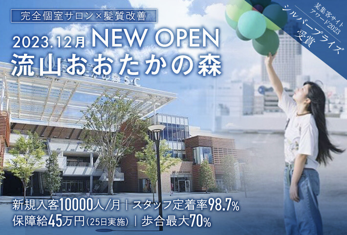◆毎月新店OPEN◆ 急成長サロンだからチャンスもたくさん! スタッフの活躍の場を広げるために これからも拡大し続けます! ◆Jr.スタイリストも保障給33.5万円◆ 働き方×稼ぎ方×プライベート… 選択肢が豊富だから理想が叶う! 「正社員or業務委託」 「たくさん稼ぎたいorプライベート派」など バランスよく働ける環境です。 【保障給+歩合で稼げる!】 総売上100万円を超えた「売上の30%」が歩合になります。 ※スタイリスト歴5年実績:平均客単価8000円 総売上120万円(入客150名)=保障給33.5万円+歩合6万円 ⇒総支給39.5万円 ◆報酬実績◆ *9~16時×週4出勤 報酬25万円/入客70名 *1日8h勤務×完全週休2日 報酬45万円/入客150名 *トップスタイリスト 報酬95万円/入客220名 *新人スタイリスト 報酬35万円/入客150名 ●賞与年2回(7月/12月) 総指名売上の3%+業績により還元 ●ビューティーアワード常連 ●スタッフ定着率96% ●育休実績あり ●土日休みOK ●時短勤務OK ●残業なし 【3ヵ月で売上100万円へ】 顧客がいない方、 マンツーマンに慣れていない方、 デビューしたての方など。 まずはきちんとヒアリングをして 3ヵ月で売上100万円を 達成させていきましょう! 【“通いやすい”ד入客しやすい”】 お客さまが無理なく通いやすいサロン。 だから全店いつでも大盛況。 スタイリストの方は、特出した技術や 過剰なサービス、SNSによる発信力が なくても大丈夫! どなたでも入客しやすい環境です! 技術にこだわりたい方も! あなた専用クーポンをつくるので 「好きなこと」で活躍しよう!