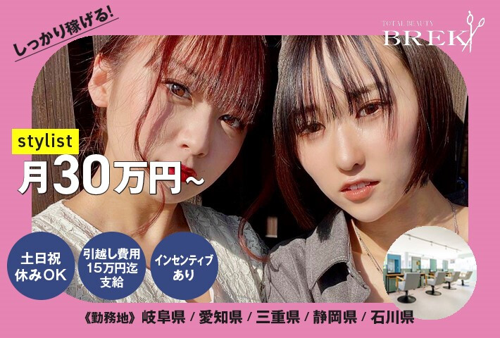 月給 30万円〜 個人売上月間75万を超える分より、 以下の%で歩合が付きます。 指名歩合:40% フリー歩合:25% 上記以外に、以下の手当有 ・店販手当:売上の25%を個人バック(ただし自社PBのみ対象) ・チーム生産性手当 ・スタイリストとアイリストを兼務いただける場合は、別途1万円手当支給 【給与イメージ】※月6~8日休み ・月間個人売上 100万円 指名割合:30%、フリー割合:70% →月給30万+歩合総額73,750円=373,750円+各種手当 ・月間個人売上 100万円 指名割合:50%、フリー割合:50% →月給30万+歩合総額81,250円=381,250円+各種手当 ・月間個人売上 100万円 指名割合:70%、フリー割合:30% →月給30万+歩合総額88,750円=388,750円+各種手当 ※月間150万個人売上 月給+歩合 50~60万+各種手当 ※月間200万個人売上 月給+歩合 65~75万+各種手当