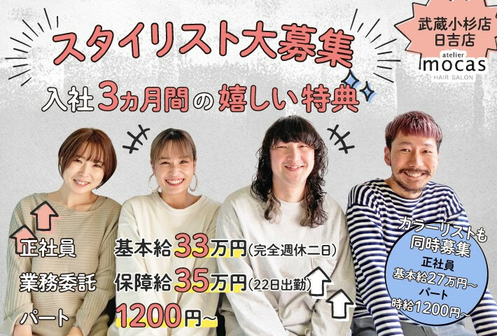 ☆2025年も続々NEWOPEN☆ 9月/10月/11月 新宿 大宮 梅田 《今がチャンス!対象人数限定!》 入社お祝い金10万円(入社後5万円+半年後5万円) ※業務委託でも社会保険加入可◎ 《保障給:ライフスタイルに合わせて選べる♪》 ~あなたはどのタイプ?~ A.保障給月35万円(月23日出勤⇒月7日休み) 顧客がいない…もしくは初めての業務委託で心配… でも入社初月から給与は下げたくない…そんな方におすすめ! B.フリー歩合47%+指名歩合47% 顧客がいない方で、まずは効率よく入客して 指名客をつくりたい方におすすめ! C.フリー歩合40%+指名歩合60% 指名をつくるのに自信がある方や すでに顧客をお持ちの方におすすめ! ※その他、働き方に合わせた保障アリ♪ ※入社3ヶ月 スタッフ満足度95%! 創立12年で全国70店舗以上! 「働きやすさ」×「効率よく稼げる」 勢いがある会社だから入客チャンスもたくさん♪ あなたの時間を有効活用しながら、 効率よく稼ぐことができます! ◆フリー:40~45% ◆指名:47~62%◆客単価7000~1.2万円 ◆1日の平均報酬約23000円 ◆店販手当(10%~20%) ◆材料費・光熱費・広告費・備品・道具類は完全会社負担 ◆平均1日5~7名 《報酬実績》 ☆スタッフ平均報酬45万円☆ 〇23歳女性、弊社でデビュー/スタイリスト歴2年 報酬44万円(1日10h、月10日休み) 〇28歳女性/社歴6ヵ月 報酬33万円(1日7h、月9日休み) 〇27歳男性/社歴1年3ヵ月 報酬57万円(1日12h、月10日休み) 〇31歳男性店長/社歴2年/店長歴5ヶ月 報酬78万円(1日10h、月7日休み)
