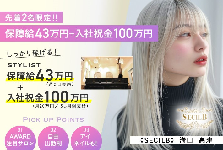 \ 急募店舗 / 流山おおたかの森/武蔵小杉 \ 他全店募集中 / 自由が丘/尾山台/溝の口/登戸/青葉台 たまプラーザ/センター南 ★☆ 1月迄入社/流山おおたかの森店限定特典 ★☆ ★入社祝い金10万円 ★3ヵ月70%バックor下記保証給 保障給60万円(26日実施) 保障給50万円(22日実施) 保障給40万円(18日実施) (※)フル番9:30〜21:30/受付10:00~20:00 (※)勤務スタート応相談 (※)詳細は面接時に (※)先着順・スタッフ定員に達し次第〆切ります。お急ぎください! ★日給2万円 (※)1ヵ月限定 (※)サロン見学を兼ねた1日体験も歓迎 〇新規集客月150~300名 全店舗集客力◎で入客のチャンス多! 〇平均客単価9,000円 〇集客・SNS・ブログ・スタイル投稿・練習会当番など一切不要&ノルマなし! 〇材料費・光熱費・広告費全額会社負担 〇引越費用一部負担 〇完全自由出勤制 時短・週1~土日休みOK 例)①日・月休み/16時退勤 ②毎週日のみ出勤 無駄なことは一切強要なし! 美容師の仕事にしっかり集中できます☆ 新規顧客が多く高単価、 がんばり次第でどんどん稼げる体制です♪ 在籍スタッフからも『働きやすい』と評価が高く 離職率はかなり低め。 美容師が幸せに働くことでお客様の満足度も高まる、 そんな良いサイクルができています♪ \ staff voice / ◇保証給制度があるので安心 ◇忙しい時は皆で協力しあうので助かります ◇スタッフ同士仲が良くストレスフリー