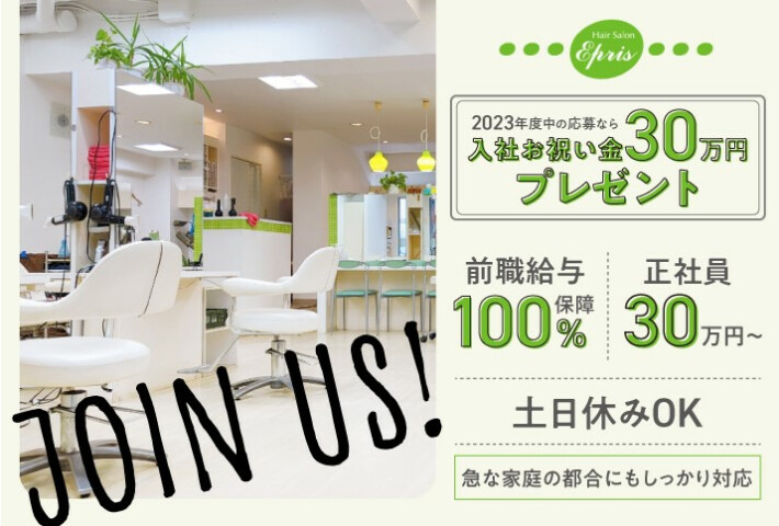 週2日出勤からOK! あなたに合った働き方をご相談ください♪ ◆交通費1.5万円まで ◆平日のみOK ◆1日5h~(9:00 ~18:00) ◆週2日~ ◆土日祝のみOK ◆スキルに応じて時給UP 《子育て世代を応援します!》 ※就業証明書の発行も可能なので お子さんの保育園入園もサポート! ※美容師復帰を応援!ブランクOK! 一人ひとりのブランク歴やスキルによって、 まずはアシスタントから始めることも可能です。 現場スタイリストが、トレンドカットや 商材のことをていねいに指導いたします。 また空き時間はモデルカットやレッスン動画、 先輩からカットを教わるなどスキルアップに使えます。 ⇒最短1ヶ月でスタイリスト復帰も可能♪ 子育て、家庭と両立しながら働く、主婦・主夫歓迎です!