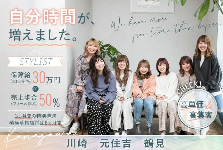 ** 溝口・高津/入社祝金キャンペーン ** ★報酬金30万円 (月々6万 5回) (※)規定による ◇キャンペーン獲得条件 30万円/週5日~8時間勤務 10万円/週3日~5時間勤務 5万円/週1日~3日・3時間勤務 ↓↓ こんな方ぜひお待ちしております ↓↓ ☑ 給料がなかなか上がらない方 ☑ もっと稼ぎたい、やった分の正当な収入を得たい方 ☑ 技術に自信がない方 ☑ マンツーマン指導でレベルアップしたい方 ☑ プライベートを充実させたい方 顧客がいない方・業務委託デビューしたばかりの方も即入客が可能です♪ ■指名料100%バック/フリー新規指名歩合60% ≪給与実績例≫アイデザイナー/週休2日制/35~50万円以上 ■交通費全額支給 ■自由出勤制/出勤時間・休日フリー ママさんパートも大歓迎・週1日~勤務OK ■完全個室完備 ■35坪大型フロア ■指名料100%バック・口コミ手当・ブログ手当 ■有給休暇 中抜けもOKなので 「ちょっと買い物に…」「役所へ手続きに…」「子どもの習い事の送迎に…」 など効率よく自由に働くことができます! デビューまでは専任担当者がマンツーマンでしっかり指導いたします。 相談など話しやすい関係を構築◎ 不安なく働ける環境づくりを心掛けておりますのでご安心ください。 技術に自信がない方には営業中に専任トレーナーがしっかり指導◎ 2人3脚でステップUPが可能です☆ アイデザイナーとして一人前にデビュー出来るまで全面的にサポート◎ 技術的にも人としても成長ができる環境でぜひリスタートしませんか?