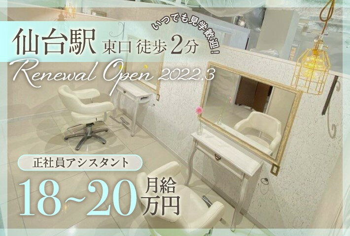 友美グループは、仙台を中心に、 山形、郡山、八戸、札幌、NYに全56店舗展開しています。 ~各店、アシスタント積極募集中☆~ インスタグラム yubi_recruit もご覧ください☆ 美容の仕事は「人」で成り立っています。 機械やロボットでは行えないサービスを 提供していくためにひとり一人の高い「人間力」や「技術力」が求められます。 友美グループでは「社会人」として 「美容のプロフェッショナル」として、 各々がお客さまと社会に貢献できる「人」になれるように、多彩な研修やスキルアップの教育を行っています。 大手グループ友美だから・・・ ■給与 20万円以上 週休2日 ■教育 本社アカデミー設備完備。 営業内レッスン。 ニューヨーク研修。 カラー講習等各種講習あり。 着付・メイクも学べる。 コンテスト・ヘアショー参加。 ■休日 【お休みも充実☆】 年間105日+有給休暇 その他にも夏季休暇・年末年始・連休可能 ■保障 【長く働ける環境☆】 社会保険・福利厚生充実・産休育休後の復帰スタッフ多数 講習費負担・各種祝い金制度・年金制度あり リアル&オンラインでの見学・面接歓迎しています! お気軽にお問合せください☆