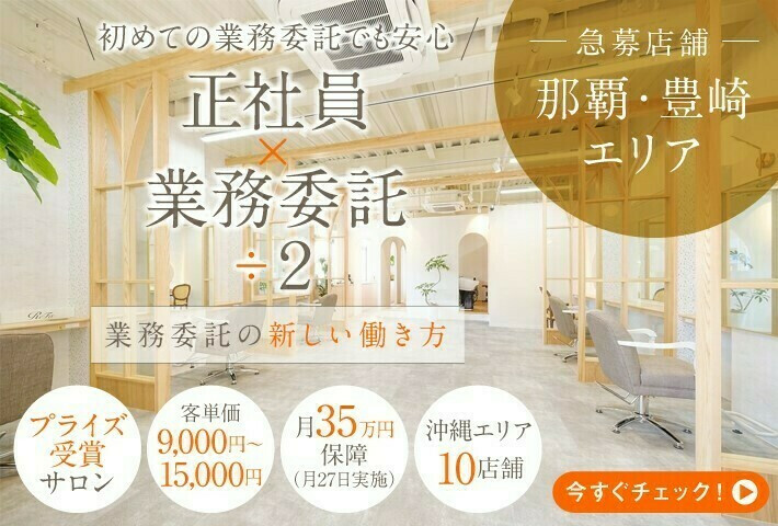 ☆2025年も続々NEWOPEN☆ 9月/10月/11月 新宿 大宮 梅田 《今がチャンス!対象人数限定!》 入社お祝い金10万円(入社後5万円+半年後5万円) ※業務委託でも社会保険加入可◎ 《保障給:ライフスタイルに合わせて選べる♪》 ~あなたはどのタイプ?~ A.保障給月35万円(月23日出勤⇒月7日休み) 顧客がいない…もしくは初めての業務委託で心配… でも入社初月から給与は下げたくない…そんな方におすすめ! B.フリー歩合47%+指名歩合47% 顧客がいない方で、まずは効率よく入客して 指名客をつくりたい方におすすめ! C.フリー歩合40%+指名歩合60% 指名をつくるのに自信がある方や すでに顧客をお持ちの方におすすめ! ※その他、働き方に合わせた保障アリ♪ ※入社3ヶ月 スタッフ満足度95%! 創立12年で全国70店舗以上! 「働きやすさ」×「効率よく稼げる」 勢いがある会社だから入客チャンスもたくさん♪ あなたの時間を有効活用しながら、 効率よく稼ぐことができます! ◆フリー:40~45% ◆指名:47~62%◆客単価7000~1.2万円 ◆1日の平均報酬約23000円 ◆店販手当(10%~20%) ◆材料費・光熱費・広告費・備品・道具類は完全会社負担 ◆平均1日5~7名 《報酬実績》 ☆スタッフ平均報酬45万円☆ 〇23歳女性、弊社でデビュー/スタイリスト歴2年 報酬44万円(1日10h、月10日休み) 〇28歳女性/社歴6ヵ月 報酬33万円(1日7h、月9日休み) 〇27歳男性/社歴1年3ヵ月 報酬57万円(1日12h、月10日休み) 〇31歳男性店長/社歴2年/店長歴5ヶ月 報酬78万円(1日10h、月7日休み)