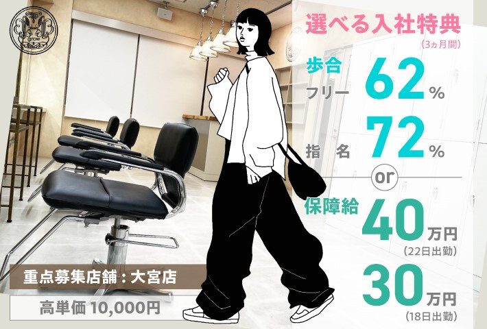 ☆2025年も続々NEWOPEN☆ 9月/10月/11月 新宿 大宮 梅田 《今がチャンス!対象人数限定!》 入社お祝い金10万円(入社後5万円+半年後5万円) ※業務委託でも社会保険加入可◎ 《保障給:ライフスタイルに合わせて選べる♪》 ~あなたはどのタイプ?~ A.保障給月35万円(月23日出勤⇒月7日休み) 顧客がいない…もしくは初めての業務委託で心配… でも入社初月から給与は下げたくない…そんな方におすすめ! B.フリー歩合47%+指名歩合47% 顧客がいない方で、まずは効率よく入客して 指名客をつくりたい方におすすめ! C.フリー歩合40%+指名歩合60% 指名をつくるのに自信がある方や すでに顧客をお持ちの方におすすめ! ※その他、働き方に合わせた保障アリ♪ ※入社3ヶ月 スタッフ満足度95%! 創立12年で全国70店舗以上! 「働きやすさ」×「効率よく稼げる」 勢いがある会社だから入客チャンスもたくさん♪ あなたの時間を有効活用しながら、 効率よく稼ぐことができます! ◆フリー:40~45% ◆指名:47~62%◆客単価7000~1.2万円 ◆1日の平均報酬約23000円 ◆店販手当(10%~20%) ◆材料費・光熱費・広告費・備品・道具類は完全会社負担 ◆平均1日5~7名 《報酬実績》 ☆スタッフ平均報酬45万円☆ 〇23歳女性、弊社でデビュー/スタイリスト歴2年 報酬44万円(1日10h、月10日休み) 〇28歳女性/社歴6ヵ月 報酬33万円(1日7h、月9日休み) 〇27歳男性/社歴1年3ヵ月 報酬57万円(1日12h、月10日休み) 〇31歳男性店長/社歴2年/店長歴5ヶ月 報酬78万円(1日10h、月7日休み)