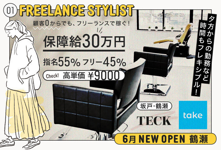 ☆スタイリスト積極募集中☆ 平均給与45万円以上! 前職給与考慮しております。 直近中途入社実績:38万円半年保証で入社☆ 各店新規客約200名と、 どの店舗でも即入客ができます♪ ◇選べる給与&休日 月8日休で29万円(最低保障給)~+歩合を選択しているスタッフが多いです! 正社員で40万円以上、50万円以上給与のスタッフも☆ ■最低保証給があるから安心して働ける! ・315,000円~+歩合(月6休) ・303,750円~+歩合(月7休) ・292,500円~+歩合(月8休) ●面接1回 ●即日採用も可能 面接時の交通費は自社で負担しています。 もちろん、見学だけでもOK! ぜひ、お店の雰囲気を見にきてください♪