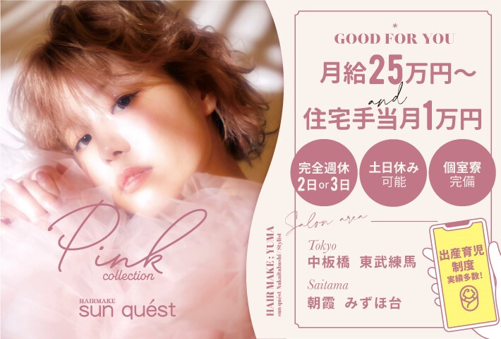 ★☆★ママ・パパ美容師活躍中★☆★ ・入学式・卒業式、夏休み・冬休み、運動会・文化祭 誕生日・七五三・節句など イベントに合わせてお休みできます ・時短勤務、土日休みもOK ・今月は休み多めに!来月はしっかり稼ぐ!ができる♪ 【ブランクあり美容師サポート】 ・技術や知識に不安がある方 ・ブランクがあり復帰できるか悩んでいる方 ・Wワーク希望 もしっかりサポート! “美容師第一”の考えでつくられたサロンです。 ーーーーーー ★☆★美容師300名に選ばれる⑨つの理由★☆★ ①【自由シフト】 土日休み/Wワーク/週1~もOK! 時短勤務・スポット出勤可能 子持ち美容師もたくさん活躍中 ②【高待遇・充実の手当】 ・口コミ手当 ・勤続年数増など プチボーナスがあります ③【安心の集客力】 グループ月間客数37,000名 集客サイトのAWARD5年連続受賞サロン ④【グループ単価更新中】 平均7000円(前年比157%UP) ⑤【選べる雇用形態】 業務委託or雇用 ⑥【グループの安定経営】 全国60店舗の成長企業 2024年1月鹿児島中央・2月梅田・赤羽出店予定 ⑦【スタッフ満足度93%】 美容師300名以上に選ばれています ⑧【交通費支給】 全額支給しています! ⑨【社会保険完備】 ・健康保険 ・厚生年金保険 ・介護保険 ・雇用保険 ・労災保険 ※時給に関しては 一都三県 1226円~ それ以外の地域 1177円~ (経験能力を考慮)