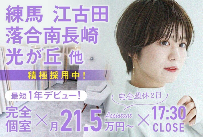 ★☆ 幅広い年代のスタッフ活躍中!第2新卒生大歓迎★☆ 【安心の待遇完備!】 ★社会保険完備 ★完全週休3日制or完全週休2日制 ★月給22万 ★ウイッグ支給 ★寮完備 ★短期デビュー スタイリストが専属トレーナーとしてマンツーマン指導いたします 確実な技術が早く覚えられます! ★月に1回は土日休みあり(12月以外) ★営業時間中の練習可能 ■完全週休2日制 ・中途アシスタント:月給22万円~+諸手当 ・スタイリストデビュー時:月給24万円+諸手当 ※前職のお給与を考慮致しますので一度ご相談下さい 充実した環境で働きながら、スタイリストデビューを目指しましょう! 一緒に楽しく働ける仲間になりませんか? 【レーニングDAY導入】 週に1日、広い店内の一部で営業時間内に講習会を行います! 効率よく成長できるために、現場の意見を取り入れて あなたの《学びやすいスタイル》を尊重いたします♪ 【スタッフが入社を決めた理由とは!!】 ・会社寮が完備されていて、社会人として自立するための福利厚生がしっかりとしていた! ・地方出身ということもあり、上京にあたって不安があったが、支援も手厚く講習制度もあり 不安なく入社できました! ・カリキュラムがしっかりとしていて、営業時間内に練習ができ、効率よくデビューできました! ・会社内イベント・入社前イベントなどが定期的に開催されていて、多店舗スタッフとの交流する機会も! 地域密着型サロンで幅広いお客様に来店頂いております! 学生さんからファミリーまで お客様と和気あいあい、毎日楽しくサロンワークをしています!