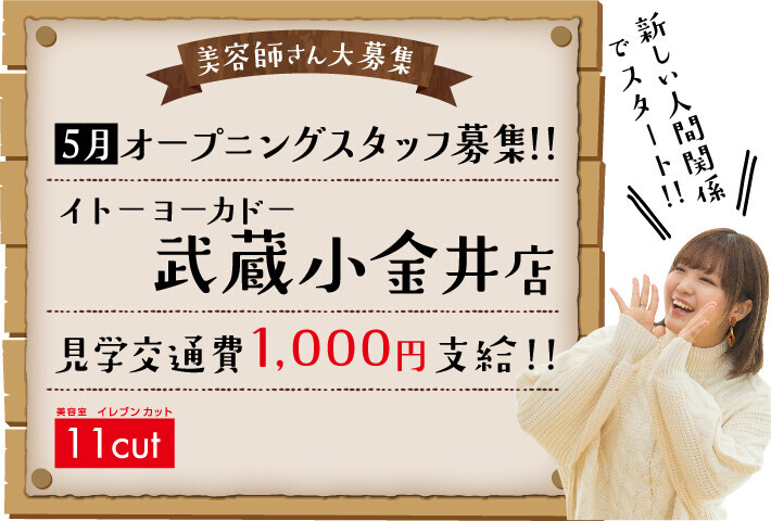 ★☆★ママ・パパ美容師活躍中★☆★ ・入学式・卒業式、夏休み・冬休み、運動会・文化祭 誕生日・七五三・節句など イベントに合わせてお休みできます ・時短勤務、土日休みもOK ・今月は休み多めに!来月はしっかり稼ぐ!ができる♪ 【ブランクあり美容師サポート】 ・技術や知識に不安がある方 ・ブランクがあり復帰できるか悩んでいる方 ・Wワーク希望 もしっかりサポート! “美容師第一”の考えでつくられたサロンです。 ーーーーーー ★☆★美容師300名に選ばれる⑨つの理由★☆★ ①【自由シフト】 土日休み/Wワーク/週1~もOK! 時短勤務・スポット出勤可能 子持ち美容師もたくさん活躍中 ②【高待遇・充実の手当】 ・口コミ手当 ・勤続年数増など プチボーナスがあります ③【安心の集客力】 グループ月間客数37,000名 集客サイトのAWARD5年連続受賞サロン ④【グループ単価更新中】 平均7000円(前年比157%UP) ⑤【選べる雇用形態】 業務委託or雇用 ⑥【グループの安定経営】 全国60店舗の成長企業 2024年1月鹿児島中央・2月梅田・赤羽出店予定 ⑦【スタッフ満足度93%】 美容師300名以上に選ばれています ⑧【交通費支給】 全額支給しています! ⑨【社会保険完備】 ・健康保険 ・厚生年金保険 ・介護保険 ・雇用保険 ・労災保険 ※時給に関しては 一都三県 1226円~ それ以外の地域 1177円~ (経験能力を考慮)