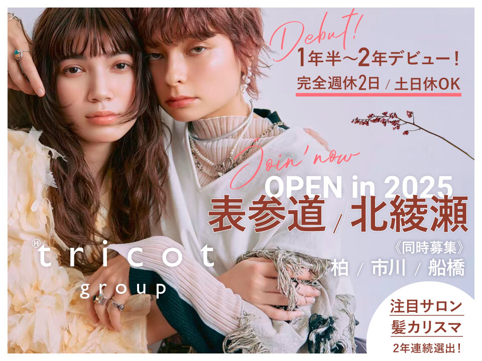 ✨OPEN情報✨ 2025年6月24日・北綾瀬 2025年7月24日・表参道 北綾瀬⇒北綾瀬駅直通の新施設ララテラス内! 表参道⇒B2出口から徒歩5分の好立地♪ ✨同時募集中✨ ⇒柏・船橋・市川 ✅教育について デビューまで充実のサポート体制でバックアップします! ・自社アカデミーあり ⇒最短1年半デビュー可能! ・メンター制度 ⇒歳の近い先輩がメンターとしてついてくれる! ・動画で学べるアプリ学習 ⇒復習や個人練習に役立つ! ・営業時間内練習OK ⇒自分のペースでデビューまで進めます♪ ・技術合格したら入客 ⇒実践を大事にしています。 ※対応や技術に関しては、バックアップを丁寧にするので安心してくださいね。 ✅待遇 ・月23万~25万(月給)+各種手当 ※店舗とお休みによって変動。 ・社会保険完備 ・有給は定期的に消化 ・引越準備金10万円支給 ・ヘッドスパ指名で歩合10%バック♪ ✅お休み ・完全週休2日制 ・土日休みOK ⇒実際に、必ず月1は土日休みにしている方や、 3連休を取得する方もいます♪ ✅デビュー後 デビュー1年で【月収30万円】を稼ぐ先輩スタッフが多数います。 技術と自分に自信を持ってデビューできる環境なので、スタイリストになってからも着実に稼げます。 ✨サロンコンセプト✨ 客数重視のスタイルではなく、お客様一人一人と丁寧に向き合います。 楽しく、無理なく、やりがいをもって、 『稼げる美容師』『人気美容師』になれる環境です。 働き方改革にも積極的に取り組んでいます! 待遇面・休日面・福利厚生面など、 『より働きやすい環境はないか?』を常に追い求め、 これからもスタッフの声を実現していきます。