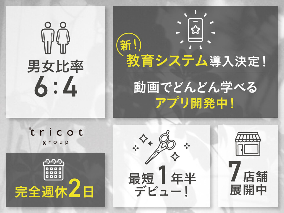日吉に展開する人気サロン♪ アシスタントの募集を開始しました! ◆平均年齢20代後半の若手が活躍中 ◆スタッフの男女比率4:6 ◆フランクな関係性。困ったときは助け合う風潮 ◆頑張りたいあなたに安心して働いてもらえる環境作りを目指しています♪ ▶アシスタント →月21万~28万円 □社会保険完備 □完全週休2日 □実働8h □土日休み相談可能 □夏季・冬季休暇あり プライベートもしっかり確保しながら、人気スタイリストの技術が学べます! また、小規模サロンならでは 一人ひとりに丁寧に、確実な技術を教えます◎ □デビューまで1年半のカリキュラム □営業時間内練習 □練習用ウィッグ代会社負担 □デビュー後も徹底サポート ・月150名以上お任せ可能 自分のお客さんを付けるチャンスがたくさん♪ ・専用クーポン作成 あなたに合った働き方で 長く美容師を続けられる環境をご用意しています。 一度サロンとスタッフの雰囲気も見てもらえると嬉しいです。 ご応募のほか、ご相談や見学だけでも大歓迎! 是非ともお気軽に一度ご連絡下さい♪