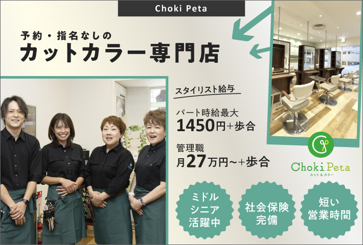 【ペタペタについて】 ペタペタは関東・関西で70店舗以上展開しているチョキペタのカラー専門店! リーズナブルな料金設定ですが、グループのスケールメリットを活かし一流商材を使用しています! その為、お客様にもしっかりとしたサービスが提供でき安心です! また、オートシャンプーを完備しております(1シャン後にオートシャンプー) シャンプーは手袋をしてOKです!さらに手袋は支給! シャンプー後のドライはセルフでお客様にお願いしております! スタッフは20代・30代・40代・50代・60代と幅広く活躍しています! 受付時間も短くワークライフバランス良く働けます! 【一般的な美容室との違い】 ・指名なし 指名制ではないので、メニューごとに業務を引き継ぎ可能 ・予約なし ・カラーは白髪染めの薬剤のみです ・オリジナル動画教育ツールあり 日々の業務、トラブル対応などを確認でき安心 【永く働ける環境です!】 ・スタッフ平均年齢50歳! ・1人営業なし 営業だけでなく締め業務においても1人営業はありません ・無理な連勤なし ・受付時間が決まっているので無理な長時間労働もなし ・出勤当日の店舗移動もなし