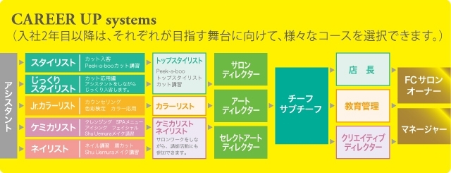 FC制度、クリエイティブ活動の充実、女性支援制度、充実した教育カリキュラムと、明確なキャリアアップシステムを整えています。
