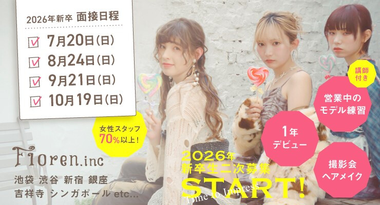 BEST SALON 7年連続受賞の Floren.inc【フローレン】 ON・OFFの メリハリのある毎日! あなたの時間を大切にしながら 無理なく1年でデビューできます! 【エリア】 池袋 渋谷 新宿 銀座 吉祥寺 高円寺 大宮 小田原 シンガポール 【面接日程】 2026年 4/26 5/24 6/21 7/26 8/23 9/27 10/18