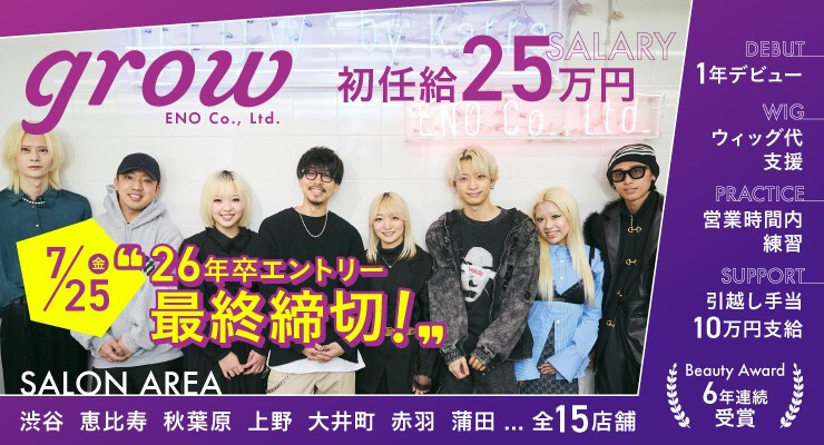 🥇 Beauty AWARD 2023 GOLD Prize 受賞 🥇 grow【グロウ】の教育メソッド 「Fast and Easy」 ☑ 3ヵ月カラーデビュー ▶▶ ハイトーン/Wカラー/ファイバープレックス ☑ 1年カットデビュー ▶▶ SNSモデル集客で実践 ☑ アカデミー完備(基本残業なし) ▶▶ 週3日アカデミー/週2日サロンワーク/週2日休日