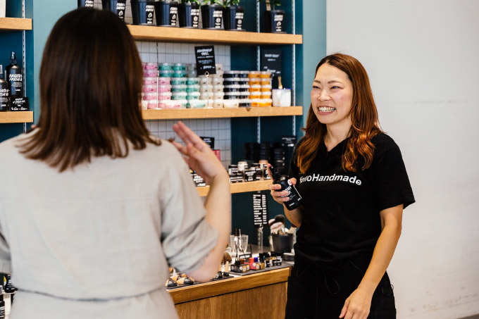 イギリスから来日したチームからトレーニングを受けたんですが、1週間ほどで全体の流れを覚えました。ただ、接客はカルチャーショックを正直、受けました。LUSHはとにかくフレンドリーで、「こんにちはー!」と元気に明るく迎え入れる感じなんです。
